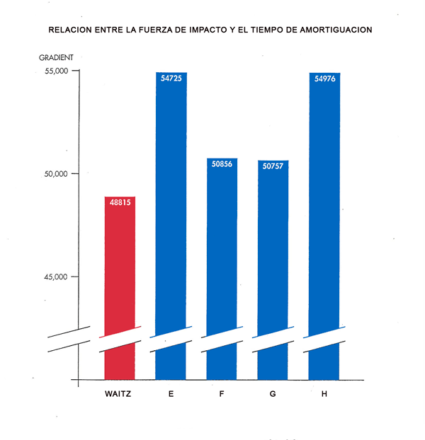 La capacidad de absorcion del impacto del cuerpo al pisar en carrera , se hizo en 1992 en el Instituto Noruego de Medicina Deportiva (NIMI) , se realizo en base a una persona de 80 Kg corriendo en una cinta , se comparo unas plantillas grete waitz con otras cuatro (marcadas E,F,G,H) de reconocidas marcas .